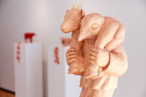What does it mean to inherit a broken tradition? Eva Sturm-Gross’s premier solo exhibition Beasts of Eden, represents an invitation into a fragmented symbolic world. The mystics of the Middle Ages teach us that the reality of creation is a shattered one, like the shards of a broken vessel. Her work thus balances the central tension of Jewish diaspora, communicating both a longing for messianic redemption on the one hand and a rootedness in exile on the other. This rootedness is expressed principally by Sturm-Gross through the animals of the Upper Valley, her homeland. The creatures that populate Beasts of Eden are drawn from her encounters with the natural landscape surrounding her childhood home in Hartland, Vermont. Biblical narratives here are portrayed by the fauna of the Upper Valley. Figures with the head of a mourning dove are cast as the protagonists of Genesis. The memory of a fox informs her representation of a vignette from the Song of Songs. A sacrificial red heifer, finally, is imagined in the form of a Vermont dairy cow. These scenes exist at the intersection of an immediate corporeal reality and the timelessness of myth. Sturm-Gross’s balance of traditionalism and experimentation makes her a unique contemporary voice. Her use of the canon is exemplified by the ubiquity of her animal-headed figures, a common motif in medieval Jewish aesthetic culture. The layered meaning of her practice mirrors the principle of manifold interpretation, wherein multiple and contradictory meanings can coexist in a singular form. Like the stained-glass windows of a medieval cathedral, the experience of this exhibition aims to communicate a feeling of proximity to the sacred that transcends its theological scaffolding. The beauty of nature and the beauty of divinity coincide to imbue this place, this landscape, with the taste of paradise. The Upper Valley in Sturm-Gross’s mythos reveals itself as a kind of Eden.